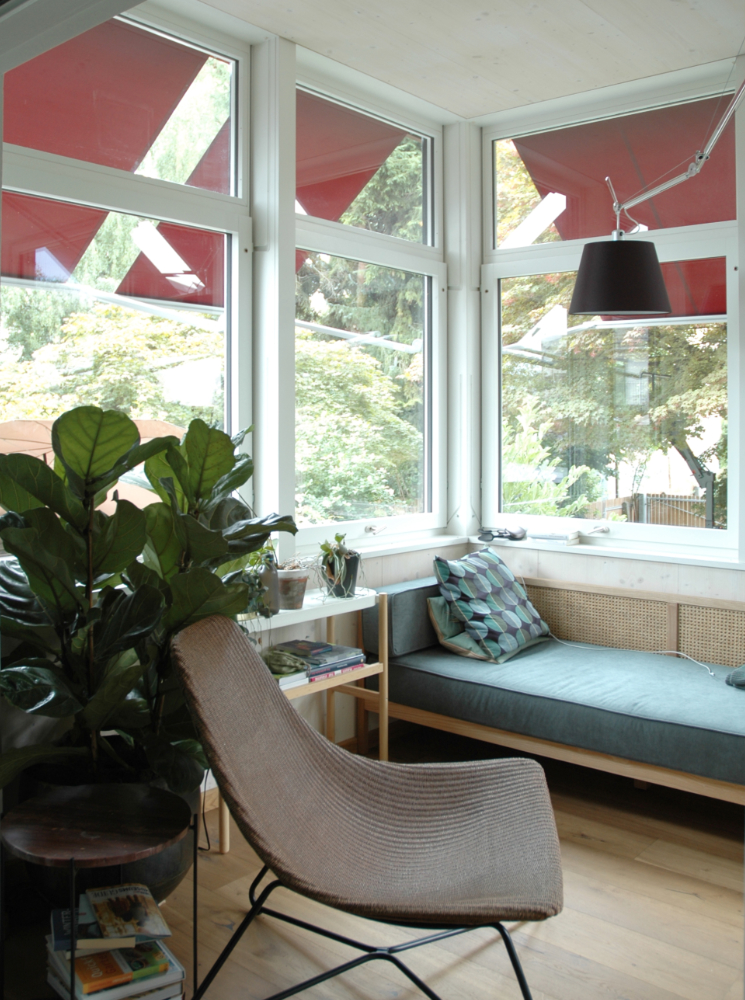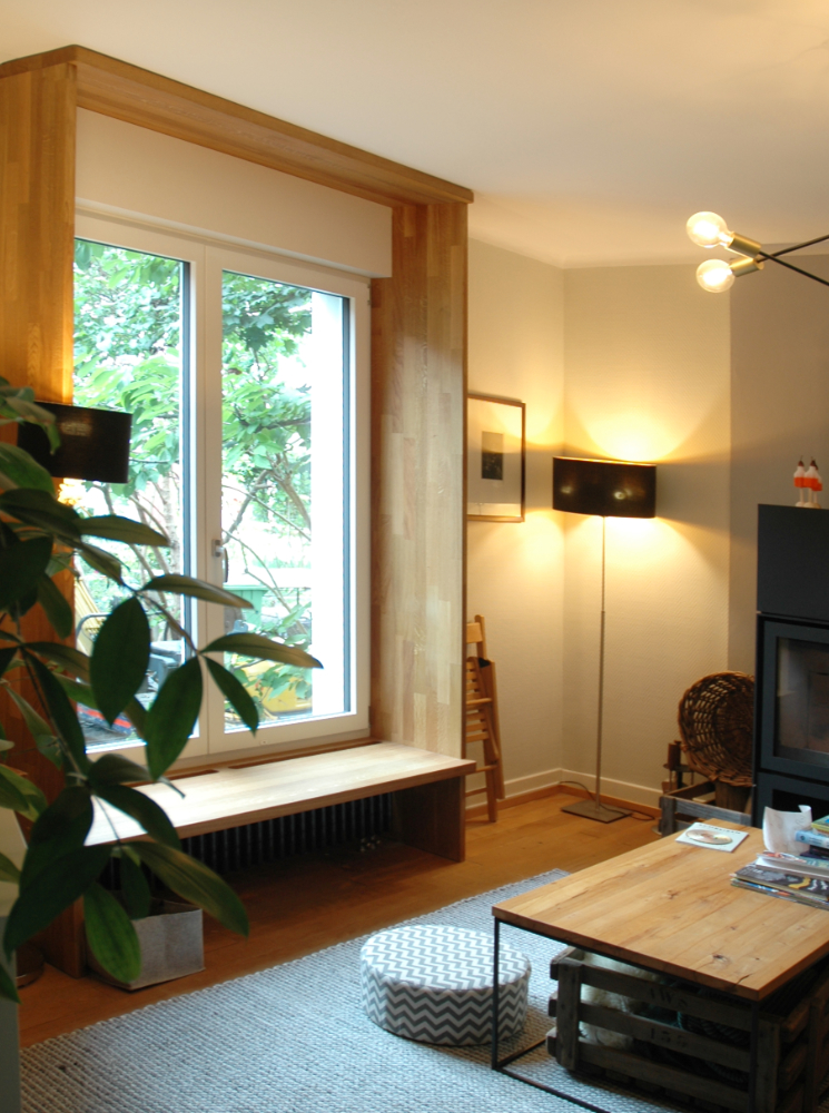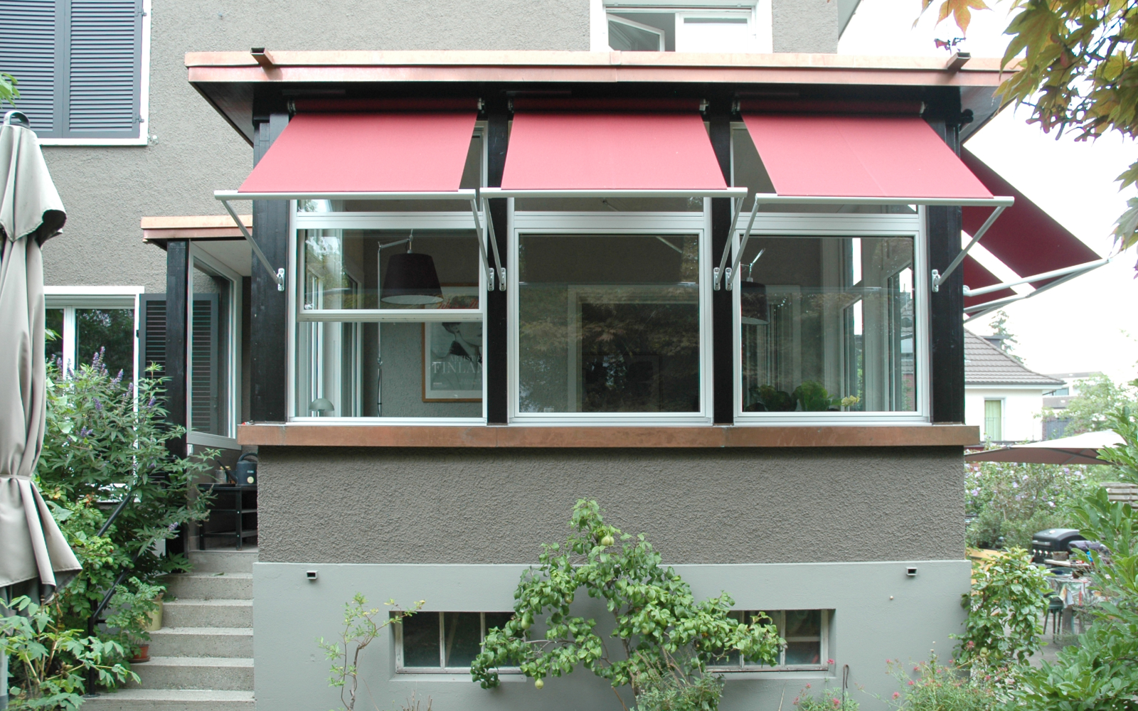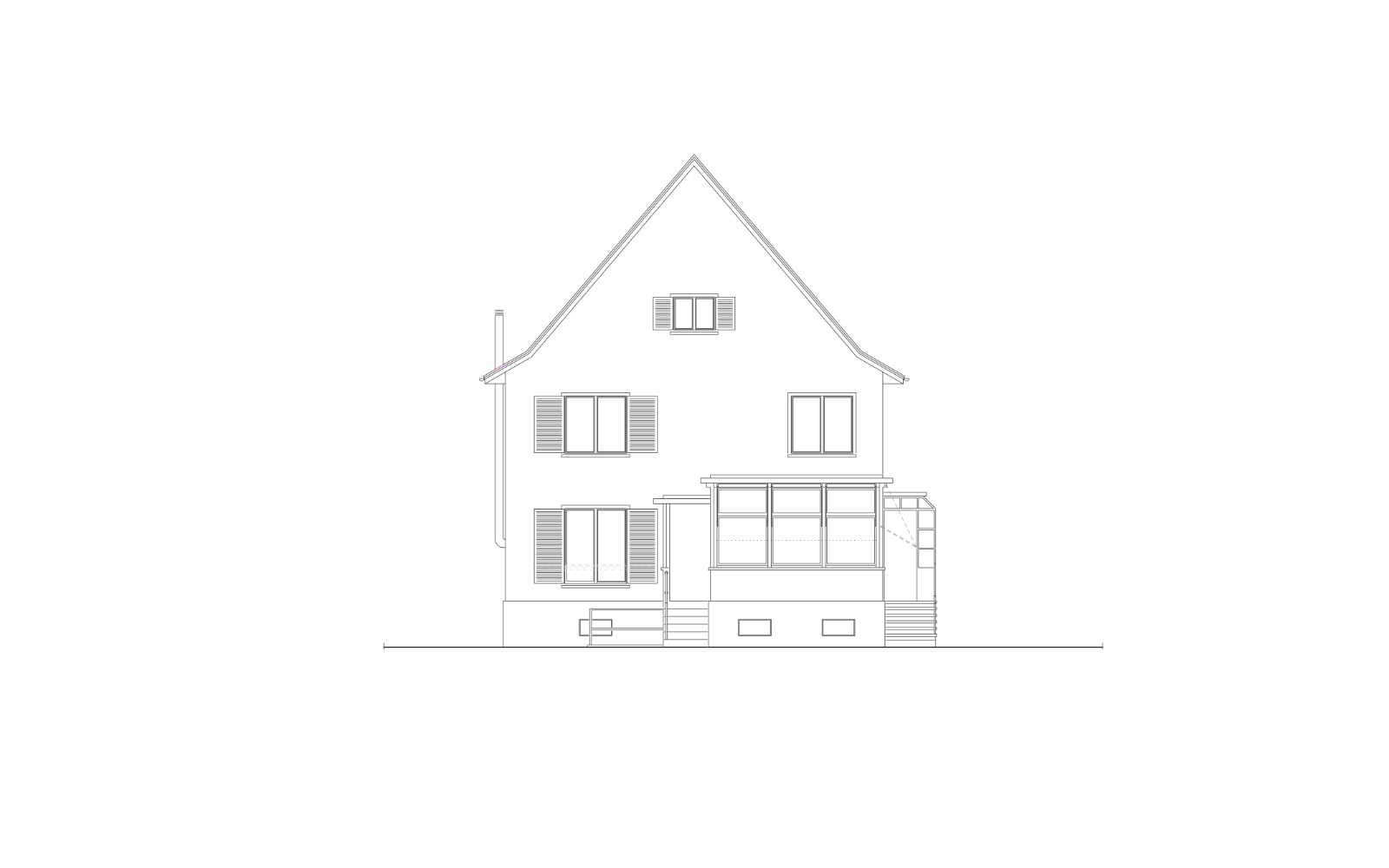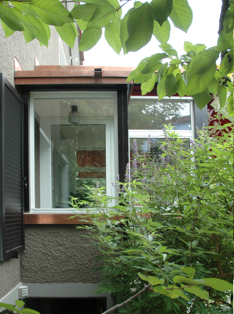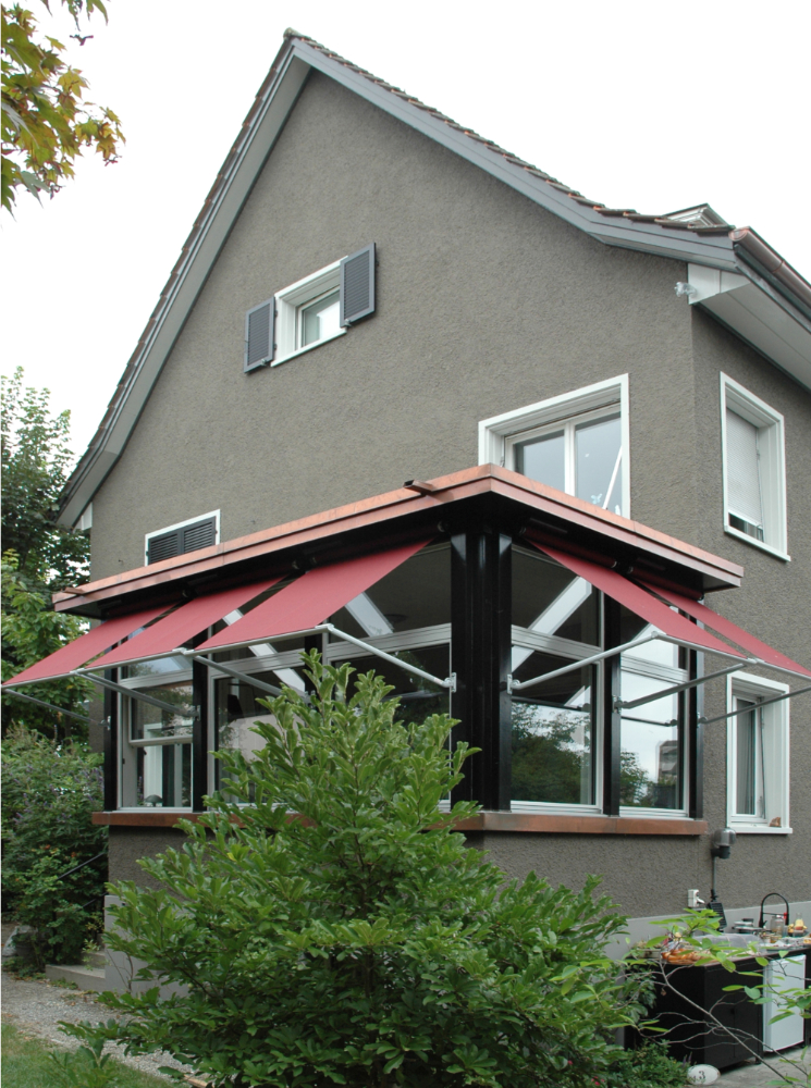 Beim Einfamilienhaus aus dem Jahr 1933 wurde die Terrasse, welche 1886 dazu kam, zu einem Wintergarten umgebaut und ein bestehendes Fenster zu einem Sitzfenster umfunktioniert. Gleichzeitig fand die Sanierung der Fassade inklusive Dachränder und Dachuntersichten statt.